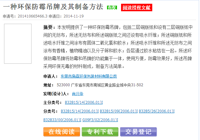 本發(fā)明提供了一種環(huán)保防霉吊牌,包括二層銅版紙和設有二層銅版紙中間的無紡布,所述無紡布和所述銅版紙之間還設有吸水纖維;所述銅版紙和所述吸水纖維之間涂布有固體二氧化氯和膠水;所述吸水纖維和所述無紡布之間涂布有香精,植物精油以及分子篩和膠水;各層通過膠水粘結在一起。所述環(huán)保防霉吊牌將防霉和吊牌的功能集于一體,使用方便,防霉效果好,所述吊牌采用環(huán)保無毒的材料制成,制備方法簡單。